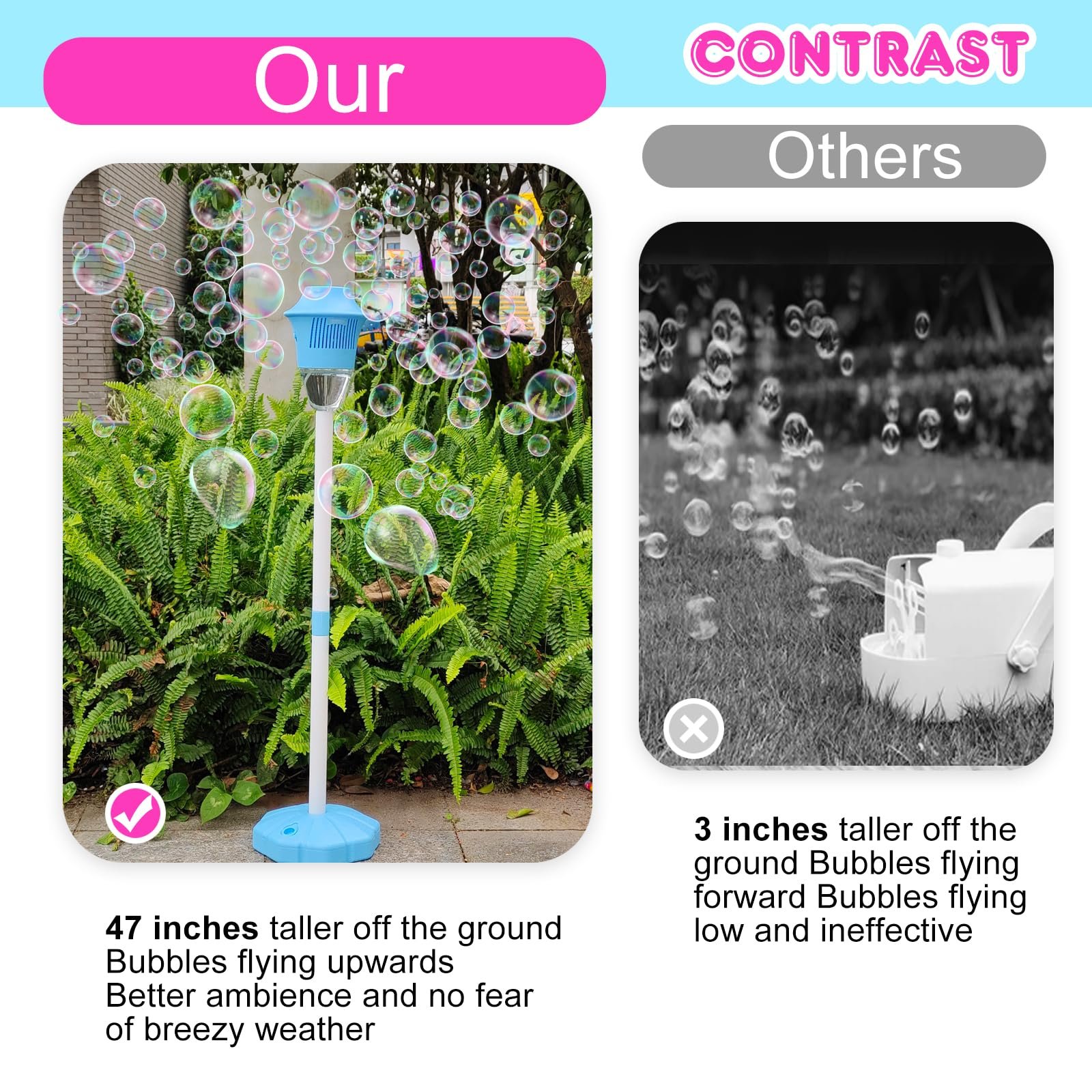 imagine that at an outdoor party, wedding or celebration, this vertical bubble machine releases colorful bubbles that float into the sky with the breeze, creating a dreamy atmosphere. Compared to ordinary bubbles machine, it does not need to be placed on a table, and uses its 47-inch height advantage to blow bubbles into the sky, creating a more spectacular visual effect, making every kids attending the event feel as if they were in a fairy tale world.
