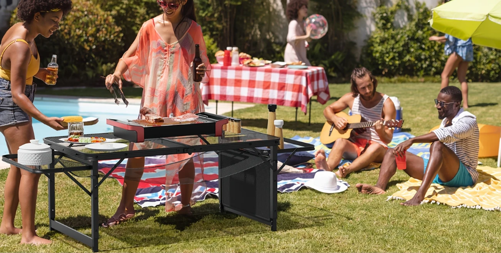 Our camping table:Our sturdy camping table is made with an aluminum tabletop that is easy to clean and won't allow sand to stand on the surface, making it perfect for use on the beach. It's also great for camping as it can be quickly cleaned or rinsed after cooking with a portable stove, and easily stored after use.