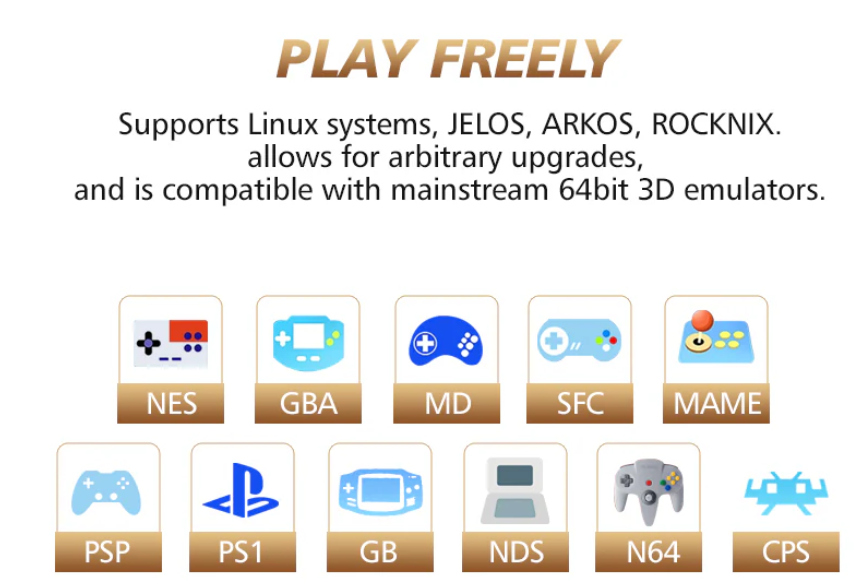 CPU: RK3326, ARM 64bit quad-core Cortex-A35 up to 1.5GHz